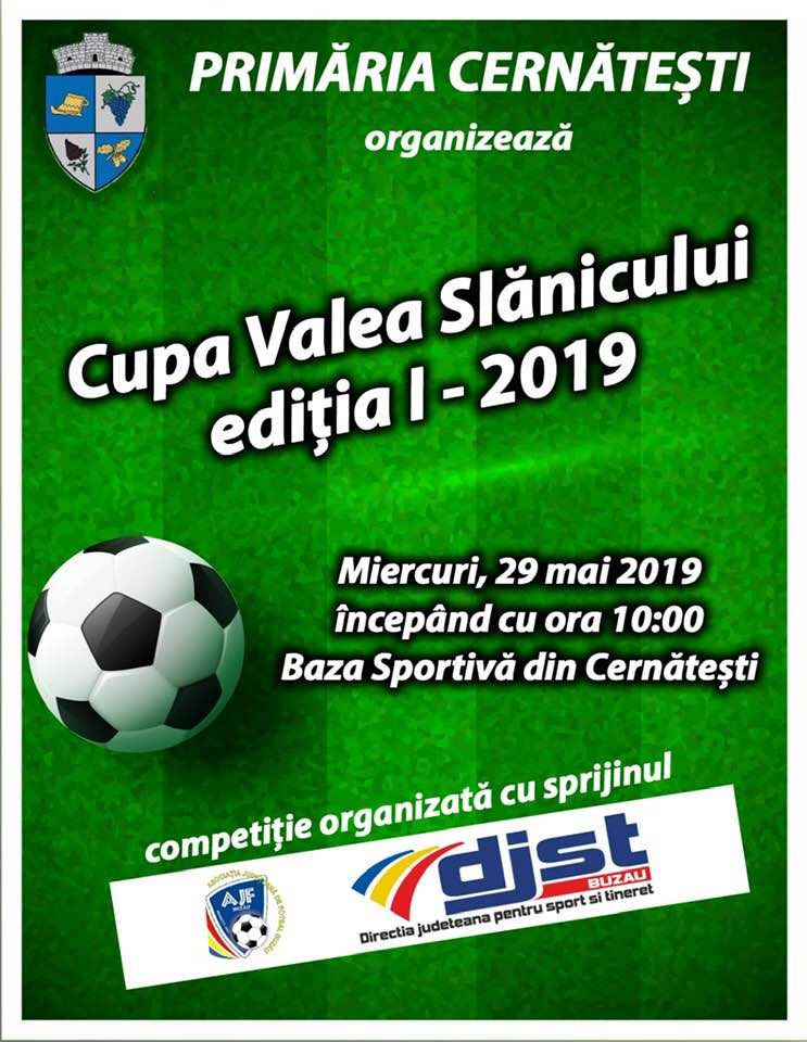 Organizată de Primăria Cernăteşti, alături de Asociaţia Judeţeană de Fotbal Buzău şi Direcţia Judeţeană pentru Tineret şi Sport, competiţia este programată să aibă loc miercuri, 29 mai, începând cu ora 10:00 şi se va desfăşura pe durata unei singure zile, în incinta bazei sportive (terenul sintetic) din comuna Cernăteşti.