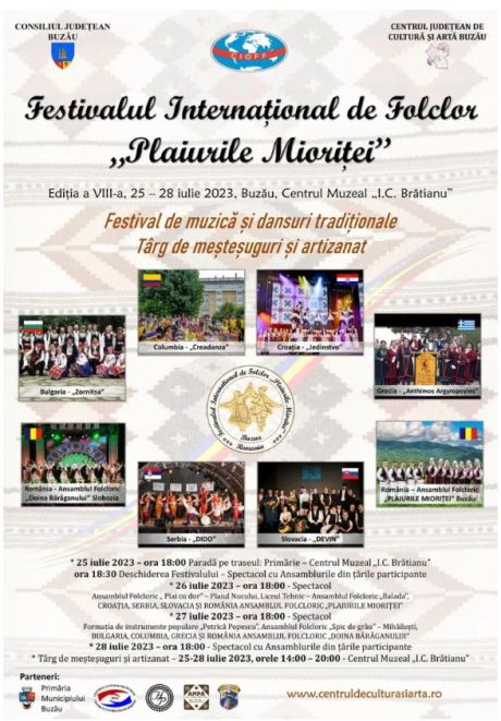 Centrul Județean de Cultură și Artă Buzău îi invită pe buzoieni la Festivalul Internaţional de Folclor „Plaiurile Mioriţei”, care se va deschide pe 25 iulie, când, începând cu ora 18.00, va avea loc o paradă pe traseul Primărie - Muzeul „I.C. Brătianu”,