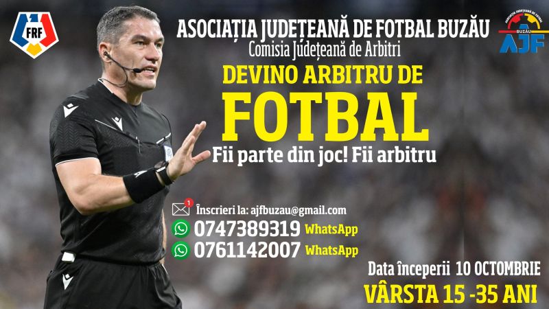 Dacă ai între 15 şi 35 de ani, eşti pasionat de sport şi doreşti să devii parte a lumii fotbalului dintr-o perspectivă diferită, acum ai ocazia să te înscrii la şcoala de arbitri. Pe 10 OCTOMBRIE, Comisia Judeţeană de Arbitri Buzău îşi va deschide cursurile pentru tinerii şi tinerele pasionaţi de fotbal.